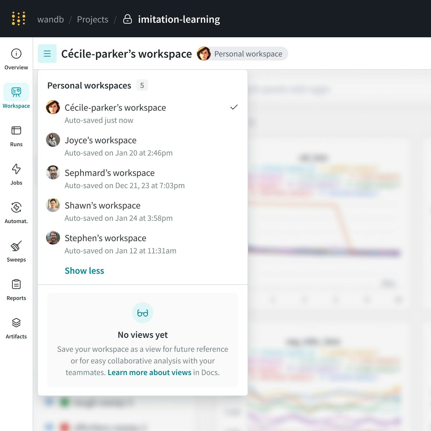 主に2つのWorkspaceカテゴリがあります: 個人用ワークスペース と 保存されたビュー です。- 個人用ワークスペース: モデルとデータの可視化の詳細な分析のためのカスタマイズ可能なワークスペースです。ワークスペースの所有者のみが編集し、変更を保存できます。チームメイトは個人用ワークスペースを閲覧できますが、他の人の個人用ワークスペースには変更を加えることはできません。
