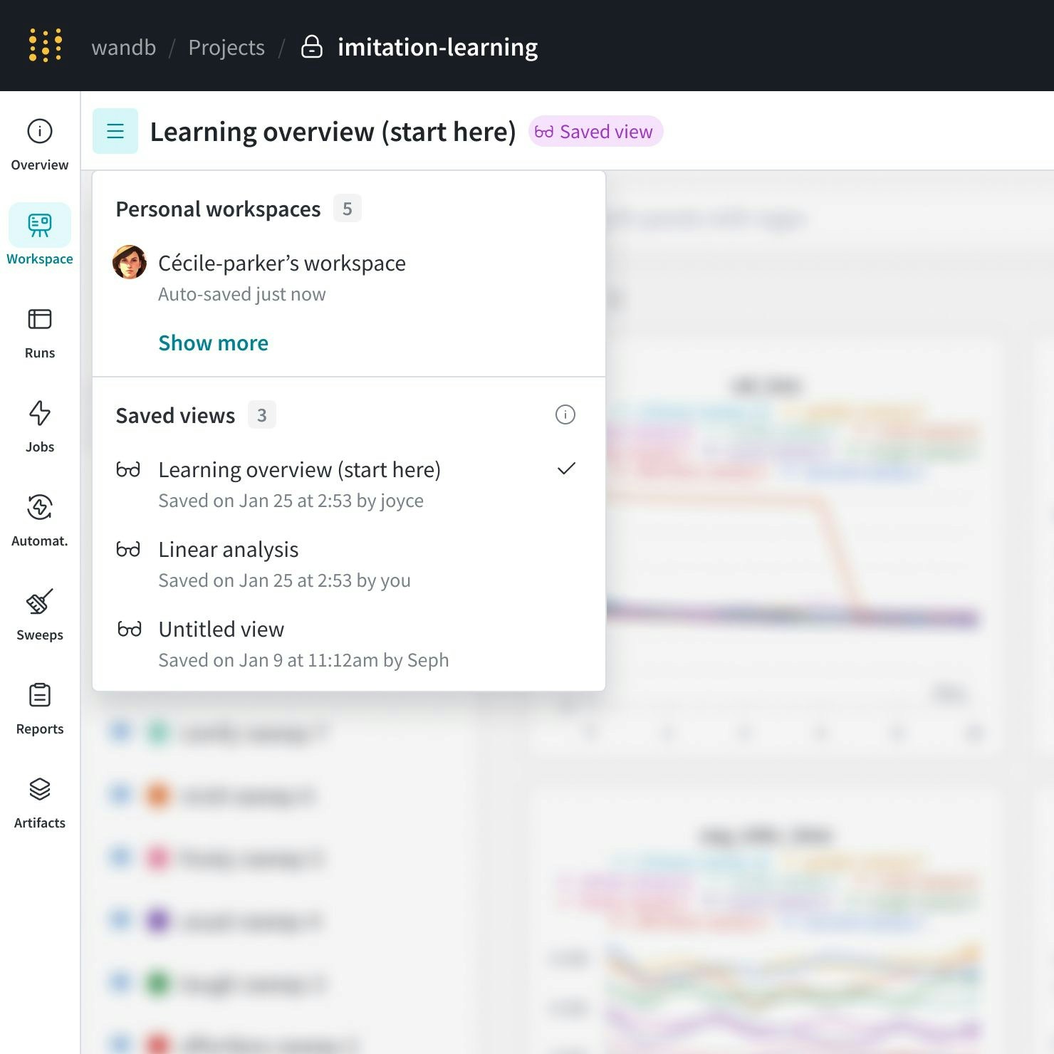 - 保存されたビュー: 保存されたビューは、ワークスペースの協力的なスナップショットです。チームの誰もが保存されたワークスペースビューを閲覧、編集、保存することができます。保存されたワークスペースビューを使用して、実験、Runなどをレビューおよび議論します。